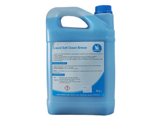 LIQUID SOFT OCEAN BREEZE is a liquid softener intended for use in institutional or commercial laundry operations. It contains optical brighteners to ensure whiteness as well as active cationic softeners. It readily disperses in hot or cold water to give uniform coverage to the entire load. LIQUID SOFT imparts an anti- static condition on fabrics to effectively control electrostatic charge in synthetic fibres.
